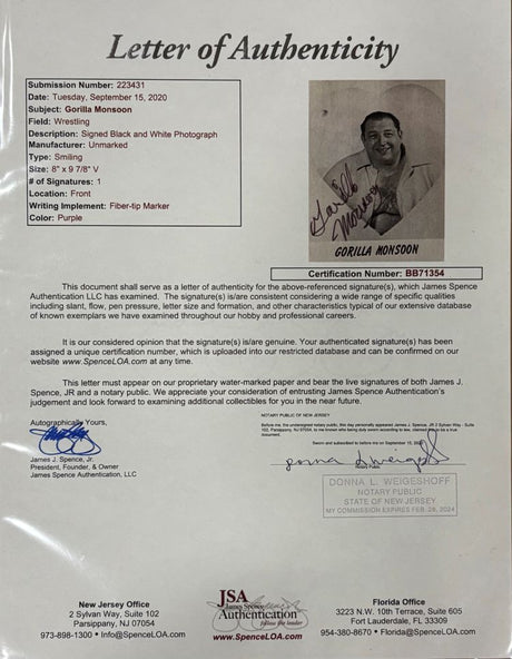 Gorilla Monsoon Signed Framed 8x10 WWE WWF Photo JSA LOA