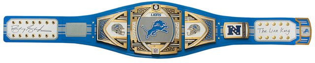 Own a true collector's piece with this Barry Sanders signed Detroit Lions WWE Legacy Full-Size Authentic Blue Wrestling Belt, featuring "The Lion King" inscription. This unique memorabilia is the perfect tribute to one of the greatest running backs in NFL history and an essential addition for dedicated Lions fans and sports collectors.