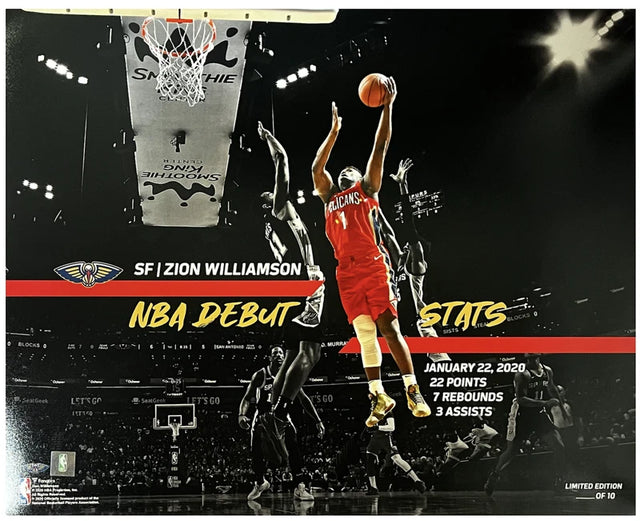 Celebrate a pivotal NBA moment with this striking unsigned photograph of Zion Williamson commemorating his debut game. Officially licensed by the NBA, this stunning piece captures the electrifying start of Zion’s professional career—a must-have for any basketball enthusiast or memorabilia collector. Zion’s NBA debut marked a new era in New Orleans Pelicans history, showcasing the potential of one of the most anticipated rookies in recent memory. Whether you're a fan of the 2020 NBA season or a believer in Zion’s historic rise, this limited edition photo is the perfect way to honor that moment.