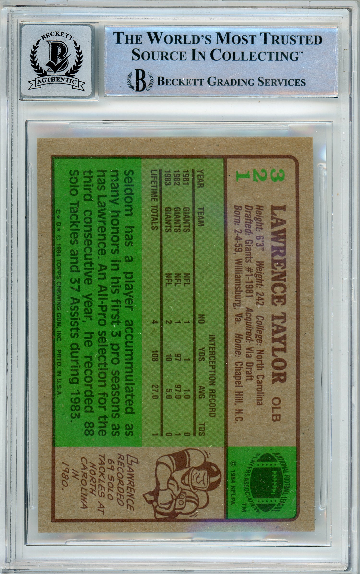 - Official 1984 Topps #321 trading card featuring Hall of Famer Lawrence Taylor
