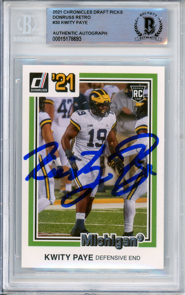Own a piece of football history with this 2021 Chronicles Draft Picks Retro #30 Kwity Paye RC BAS Autograph 10 sports trading card. This rare rookie card is hand-signed by Kwity Paye and professionally authenticated with a perfect 10 autograph grade by BGS, ensuring authenticity and top-tier collectible value.
