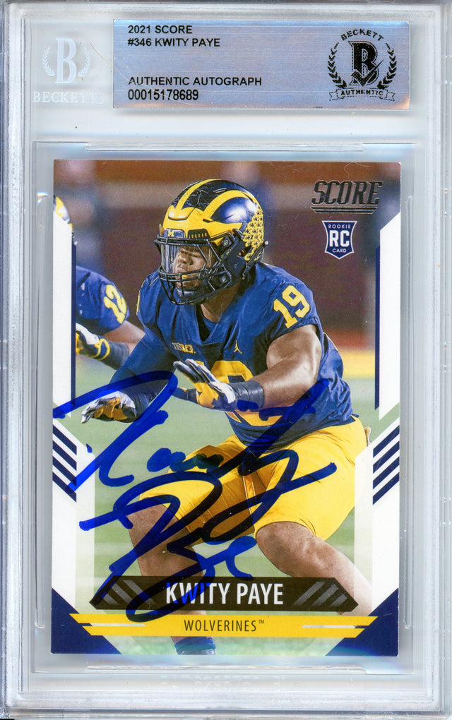Own a piece of football history with this 2021 Panini Score #346 Kwity Paye RC Michigan BAS Autograph 10 sports trading card. This rookie card is hand-signed by Kwity Paye, the standout defensive end from the University of Michigan, and has been professionally authenticated and graded a perfect 10 by Beckett Authentication Services (BAS).