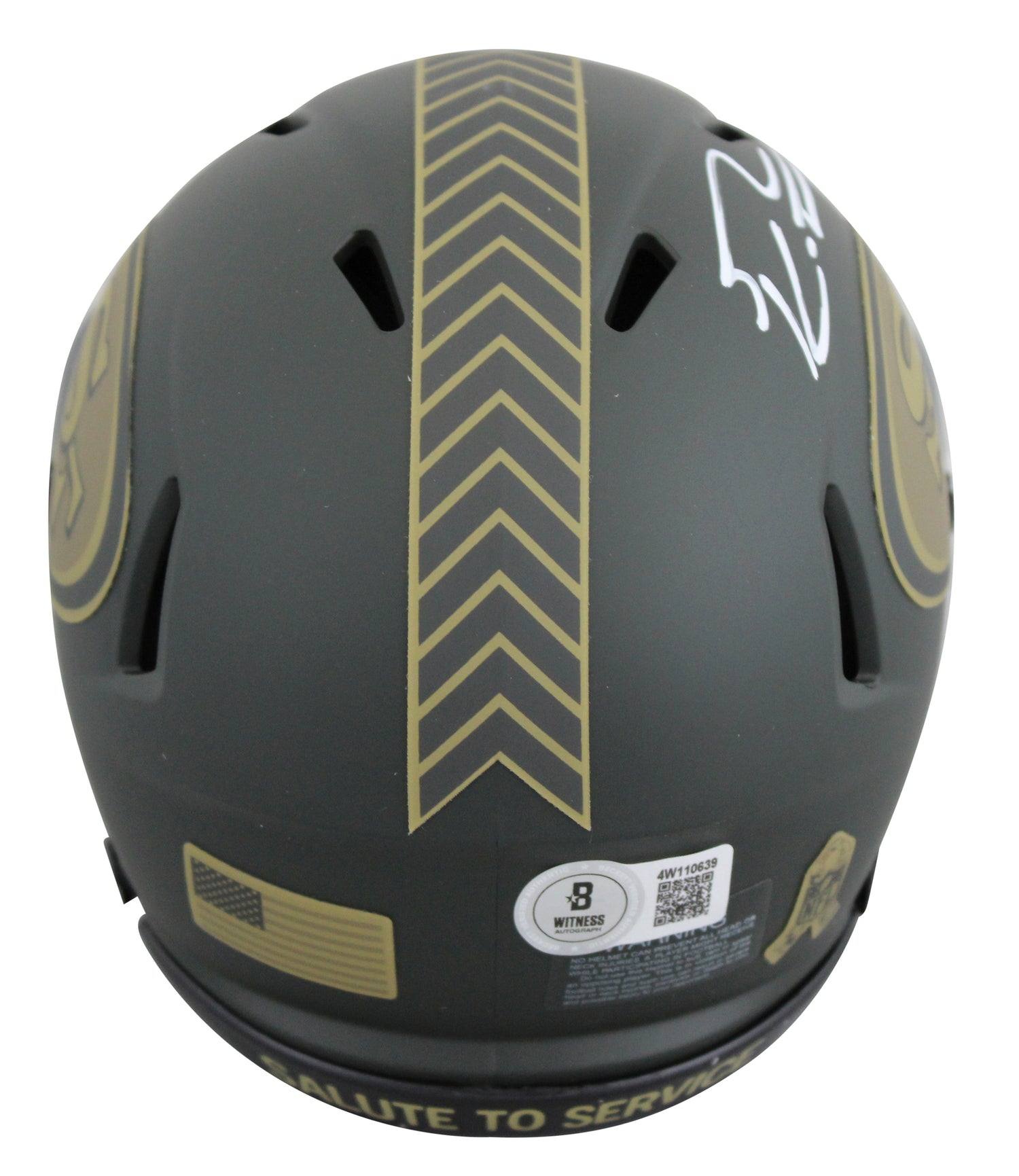 Celebrate your passion for the San Francisco 49ers with this George Kittle Autographed Alternate Salute To Service IV Speed Mini Helmet, proudly displayed in a UV mirrored back acrylic display case. This exclusive piece of NFL memorabilia is personally signed by George Kittle, star tight end for the 49ers and a fan-favorite known for his intensity, leadership, and playmaking ability. Each mini helmet is authenticated by Beckett Authentication Services (BAS), one of the most trusted names in sports memorabilia verification. This item is part of the BAS Witnessed Protection Program, ensuring a Beckett representative was present at the time of the signing. Whether you're a die-hard 49ers supporter, a George Kittle superfan, or a serious collector of signed NFL memorabilia, this helmet is an iconic piece that brings value, display appeal, and authenticity to your collection.