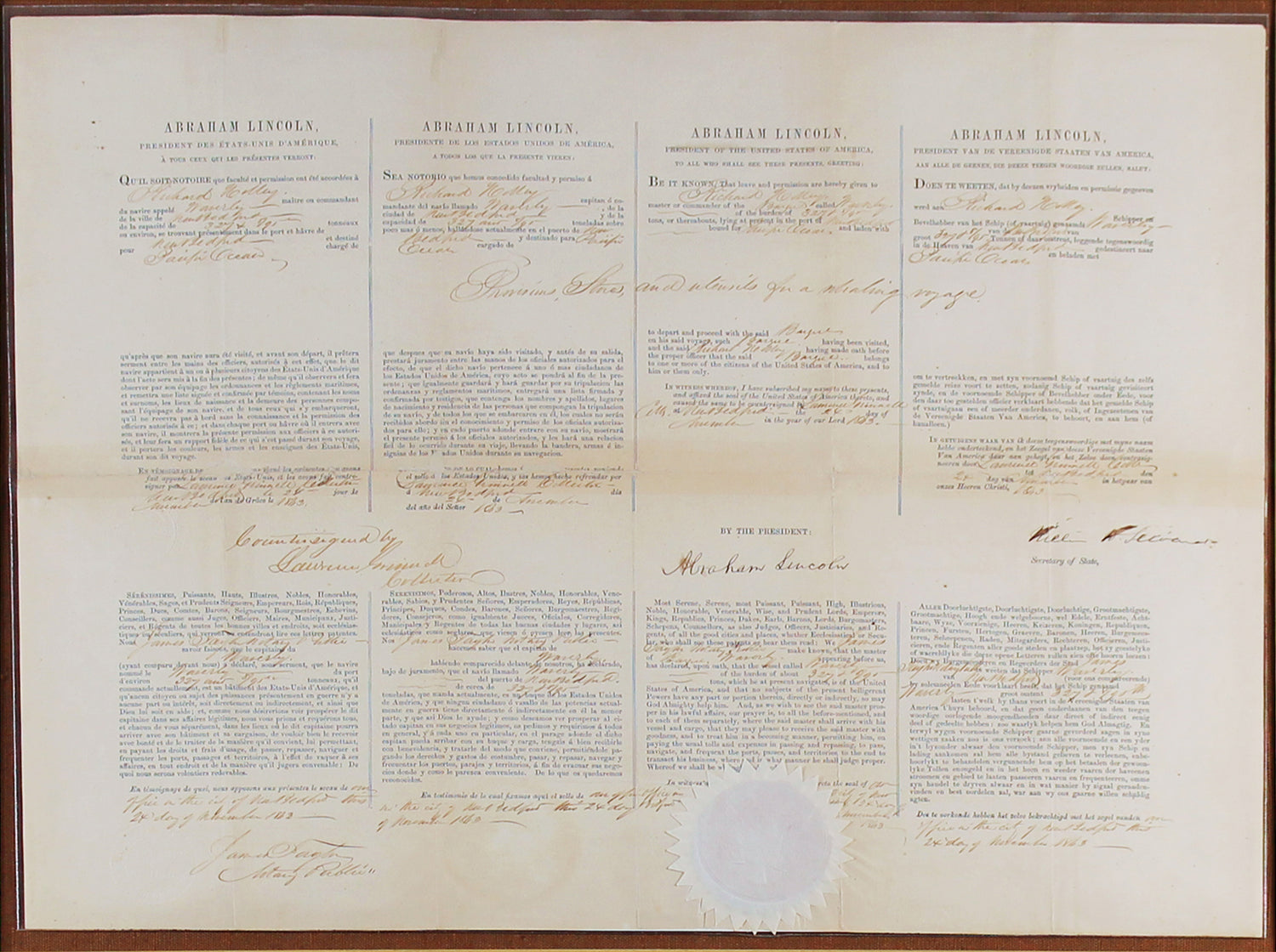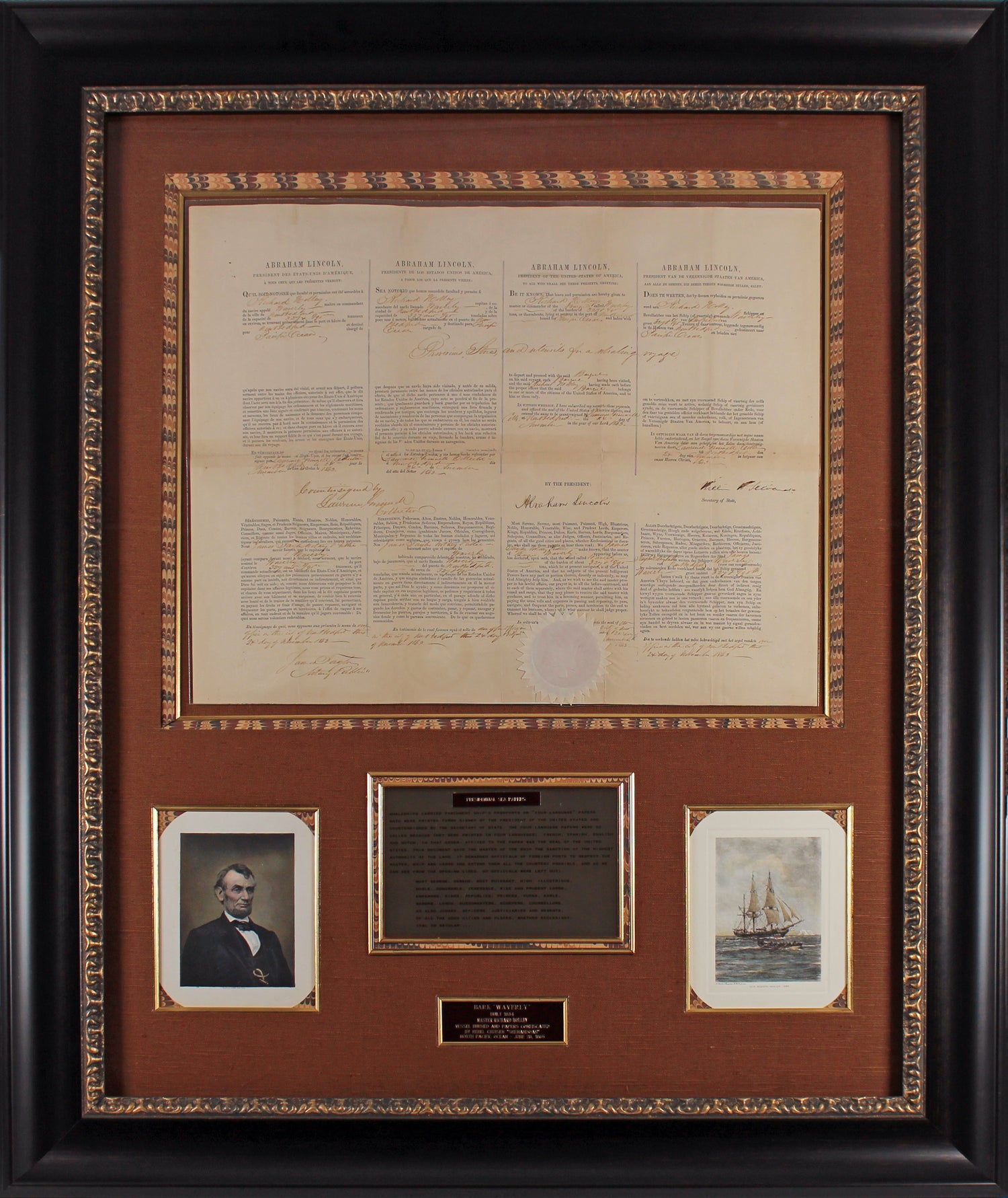 - Historical Significance – A rare 4-language ship’s passport document, an essential maritime clearance used during Lincoln’s administration.