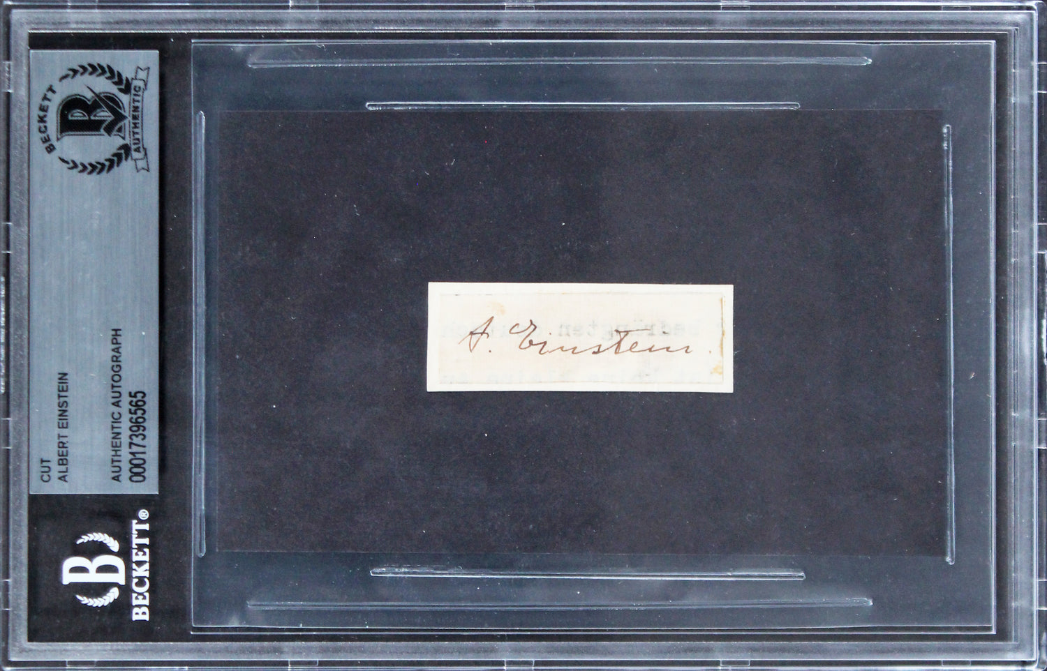 Own a rare piece of history with this Albert Einstein Autographed 5x1.85 Cut Signature, a must-have for collectors of science and cultural icons. This extraordinary item has been personally signed by Albert Einstein and comes authenticated and slabbed by Beckett Authentication Services, ensuring its 100% authenticity.