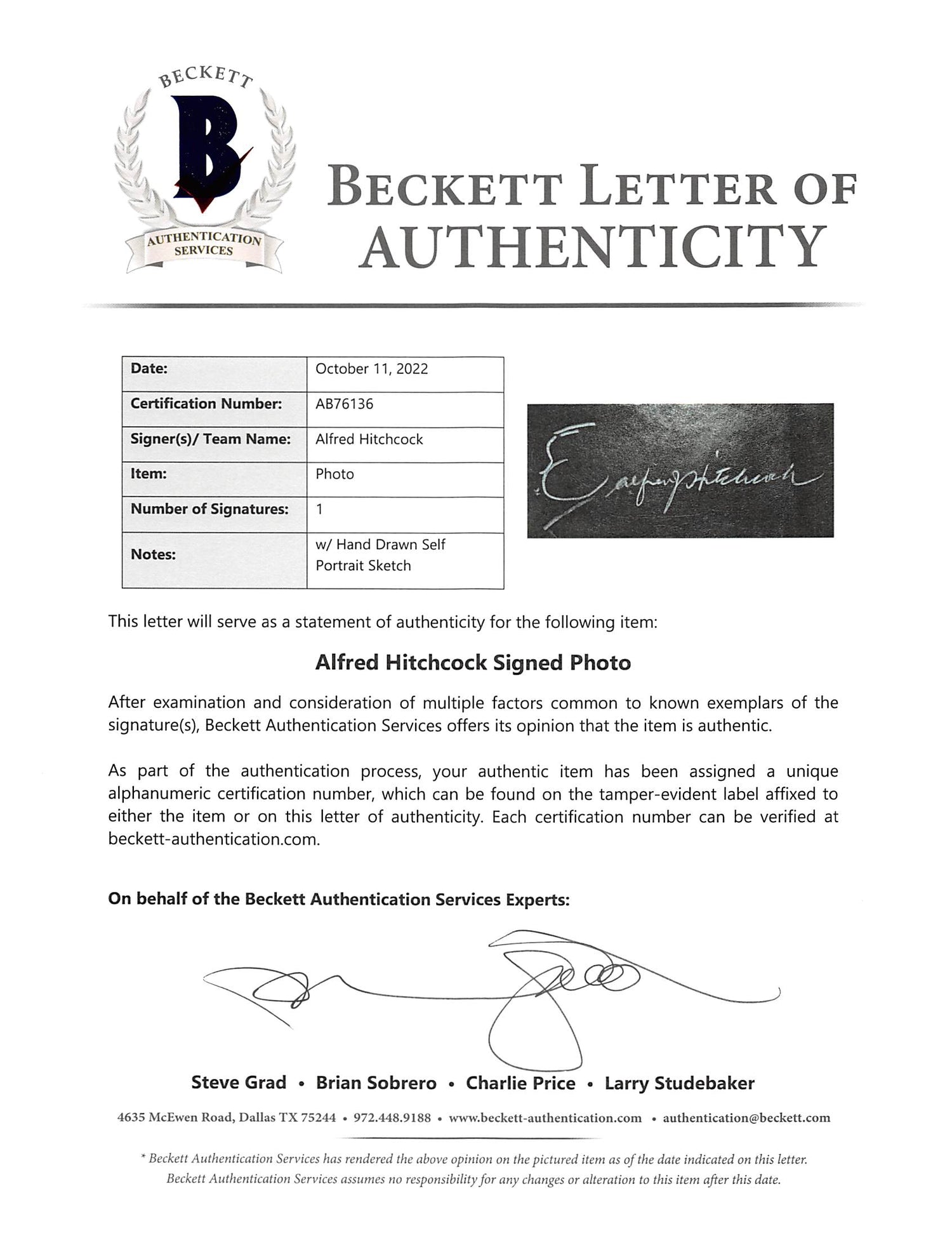 Alfred Hitchcock Signed B&W 10x13 Photo w/ Self Portrait Sketch BAS #AB76136