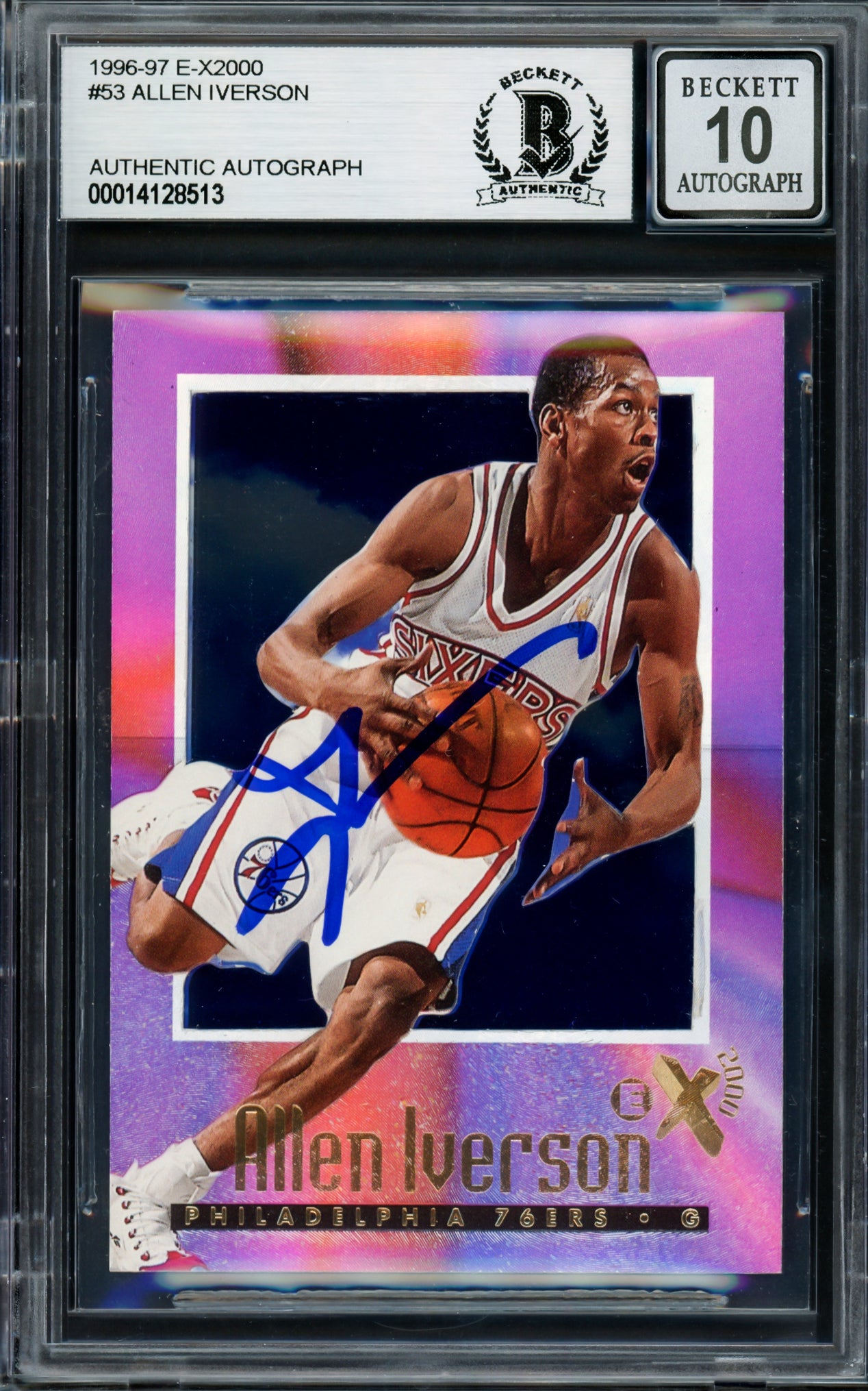 Allen Iverson Autographed 1996-97 Skybox E-X 2000 Rookie Card #53 Philadelphia 76ers Auto Grade Gem Mint 10 Beckett BAS #14128513