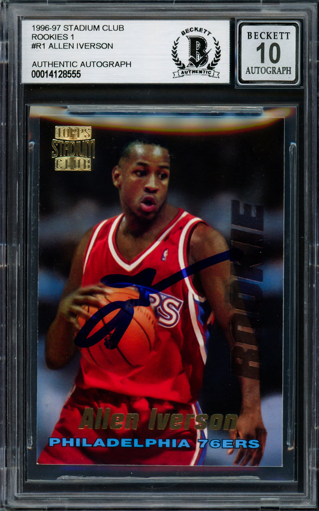 Allen Iverson Autographed 1996-97 Stadium Club Rookie Card #R1 Philadelphia 76ers Auto Grade Gem Mint 10 Beckett BAS #14128555