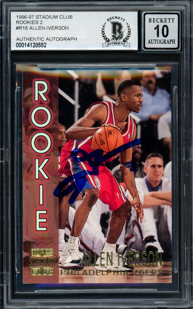 Allen Iverson Autographed 1996-97 Stadium Club Rookie Card #R16 Philadelphia 76ers Auto Grade Gem Mint 10 Beckett BAS #14128552