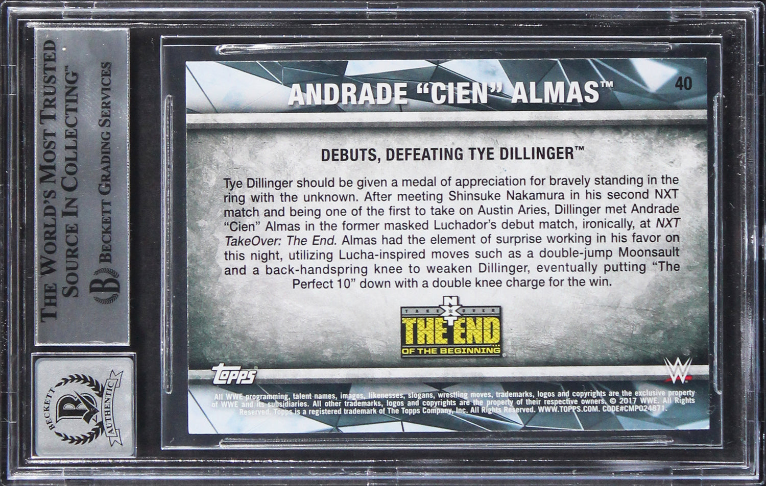 Andrade Almas Authentic Signed 2017 Topps WWE NXT M&M #40 Card Auto 10! BAS Slab is backordered and will ship as soon as it is back in stock.