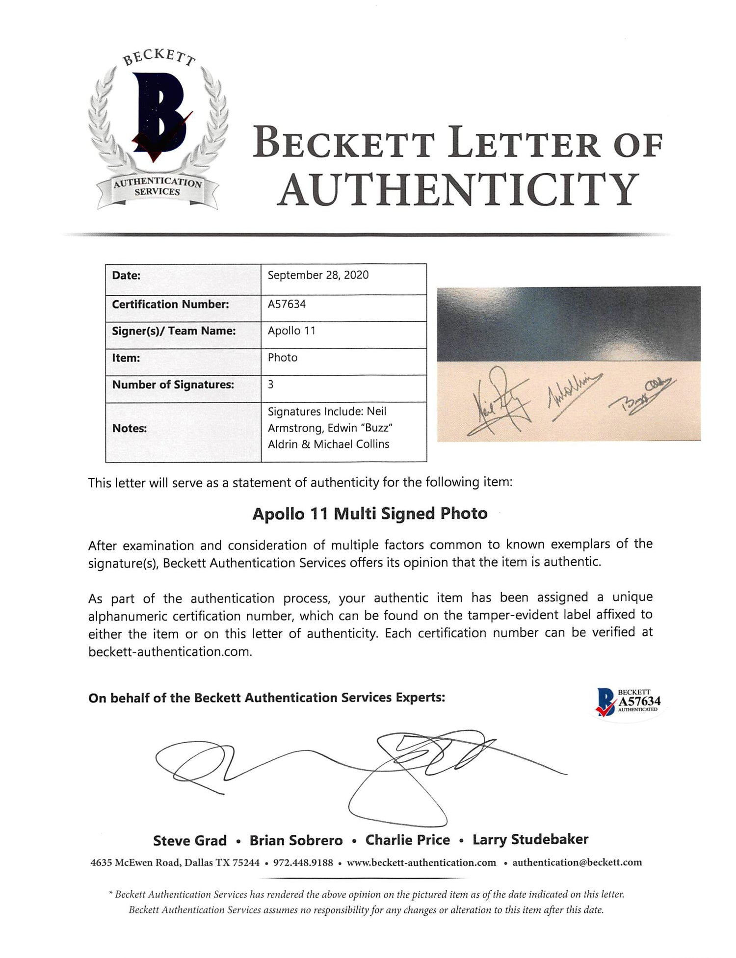 - 100% Authentic Signatures – Personally signed by Neil Armstrong, Buzz Aldrin, and Michael Collins on the matting below the photo.