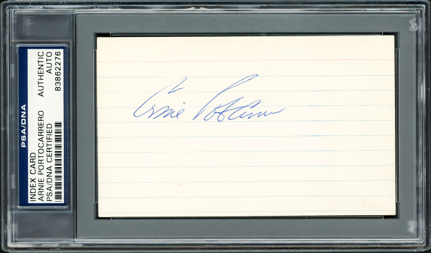 Own a piece of baseball history with this Arnie Portocarrero hand-signed 3x5 Index Card. A standout pitcher during the 1950s, Portocarrero played for the Philadelphia & Kansas City Athletics and the Baltimore Orioles, leaving his mark on Major League Baseball. This rare autograph has been certified authentic by PSA/DNA and comes encapsulated in their tamper-proof holder, ensuring its preservation for years to come.