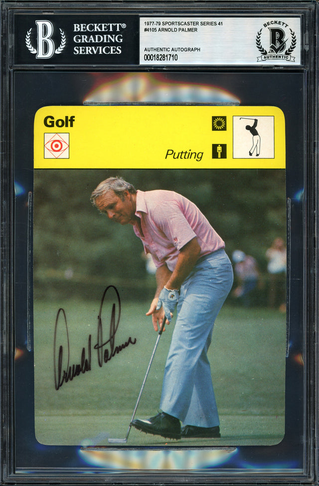 Celebrate one of golf’s most legendary figures with this 1978 Sportscaster Card #41-05 signed by Arnold Palmer—a rare and highly collectible piece of sports memorabilia. Measuring approximately 5x6 inches, this vintage collectible captures the essence of Palmer’s iconic career during the golden age of golf. Authenticated by Beckett Authentication Services (BAS) and encapsulated in their tamper-proof holder, this signed card guarantees both authenticity and long-term preservation for serious collectors and fans alike.