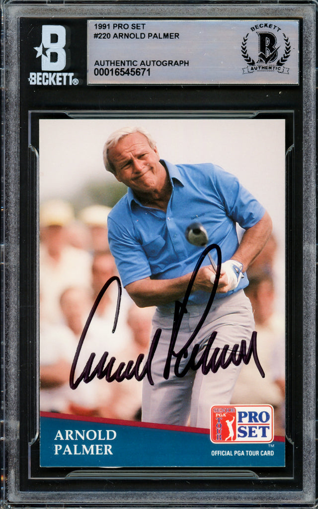 Own a piece of golf history with this 1991 Pro Set Card #220, hand-signed by the legendary Arnold Palmer. A true icon of the sport, Palmer's influence on golf transcends generations, making this autographed card a must-have for collectors and fans alike. Authenticated by Beckett Authentication Services (BAS) and securely encapsulated in a tamper-proof holder, this card ensures long-term preservation and authenticity.