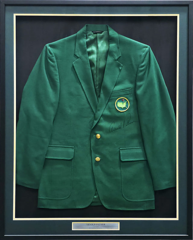 Celebrate golf history with this stunning collectible — a Framed Masters Green Jacket hand signed by Arnold Palmer, one of the most iconic figures in sports history. Measuring approximately 33x41 inches with the frame, this eye-catching piece pays tribute to a legend whose impact on the game is timeless. Arnold Palmer, affectionately known as "The King," was a seven-time major champion and a four-time Masters Tournament winner who redefined golf’s popularity throughout the 1950s and ’60s. This autographed Masters Green Jacket evokes the spirit of Augusta and Palmer’s enduring legacy, making it a must-have centerpiece for any serious golf memorabilia collection.