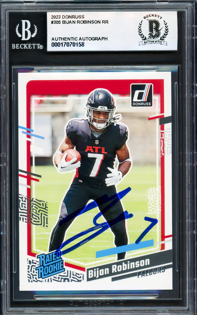 Bijan Robinson Autographed 2023 Donruss Rated Rookie Card #305 Atlanta Falcons Beckett BAS Stock #233951 is backordered and will ship as soon as it is back in stock.