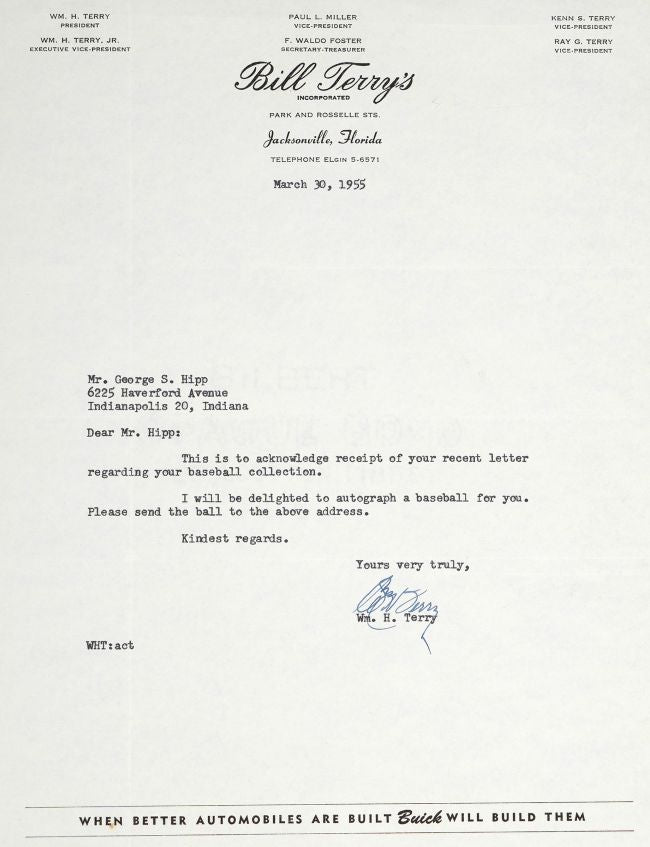 - Hand-signed by Hall of Famer Bill Terry, the last NL player to hit .400 (.401 in 1930)