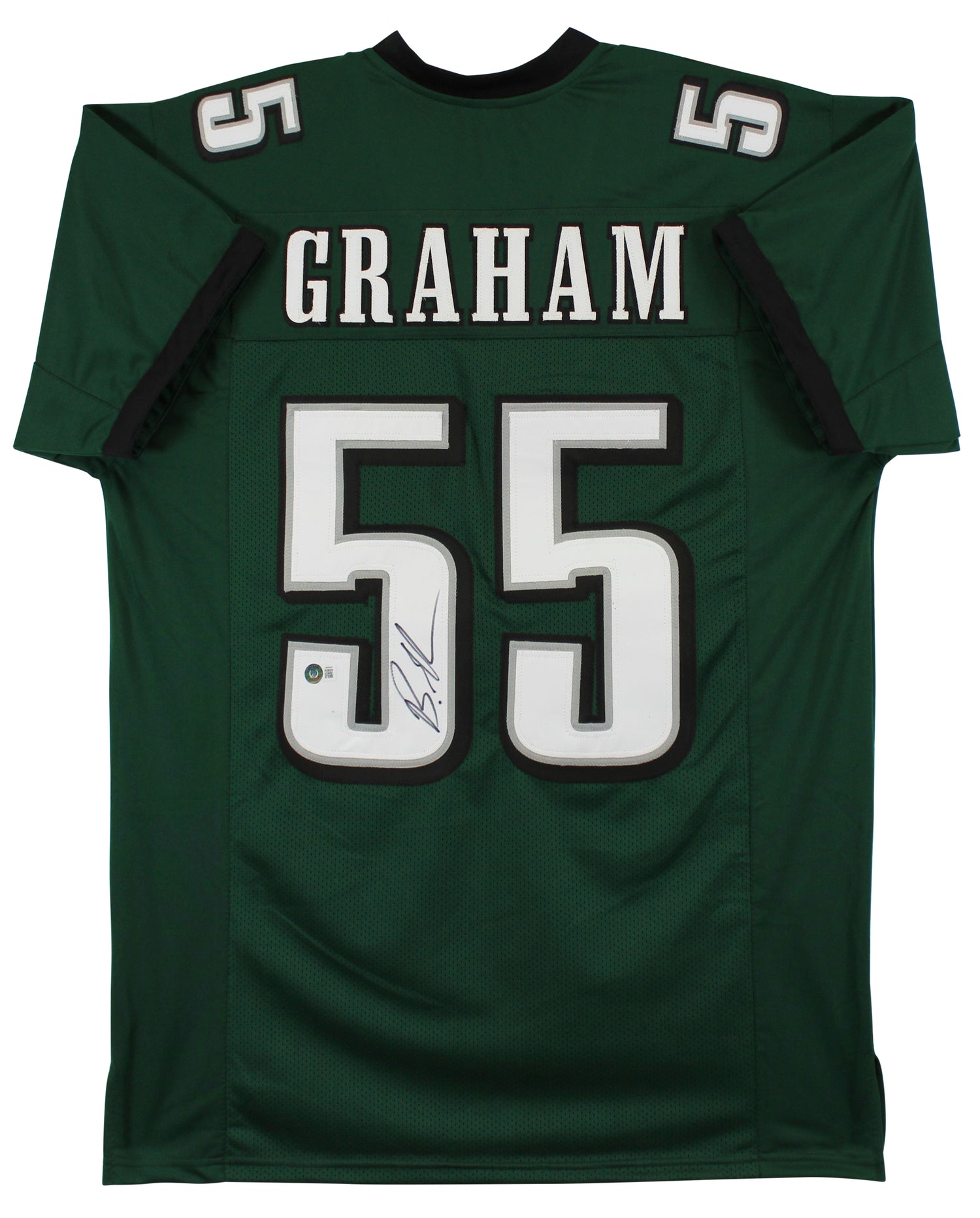 This Brandon Graham Autographed Green Pro Style Jersey is a must-have for devoted Philadelphia Eagles fans and sports memorabilia collectors. Personally signed by standout defensive end Brandon Graham, this jersey is an iconic piece celebrating one of the Eagles' most beloved players. It comes with guaranteed authenticity, making it a valuable addition to any collection.