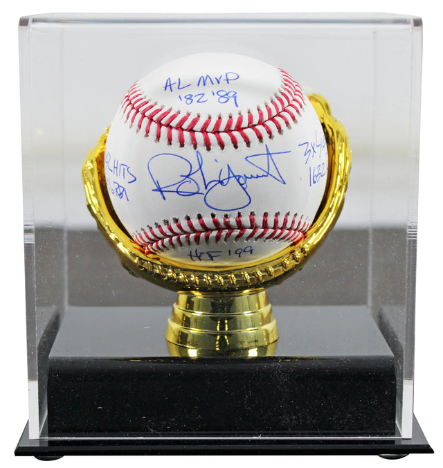 Own a piece of baseball history with this Robin Yount Autographed Official Major League (OML) Baseball displayed in a Gold Glove Acrylic Display Case. A true collector's item, this baseball is personally signed by Milwaukee Brewers legend Robin Yount, featuring an exclusive inscription highlighting his legendary career: