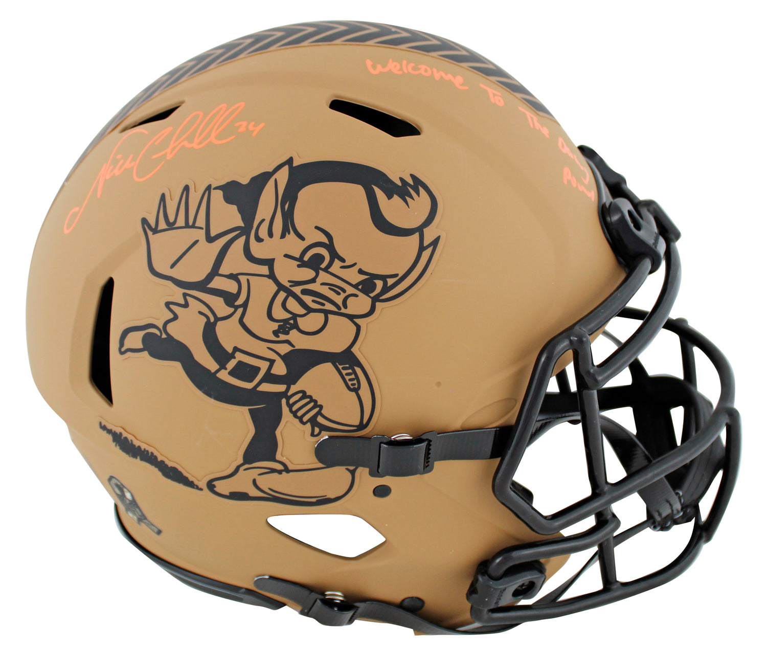 Own a piece of Cleveland Browns history with this Autographed Alternate 2023 Salute to Service II Riddell Authentic Full-Size Speed Proline Helmet, personally signed by Nick Chubb. This exclusive collectible features the inscription "Welcome To The Dawg Pound", making it a must-have for dedicated Browns fans and memorabilia collectors.