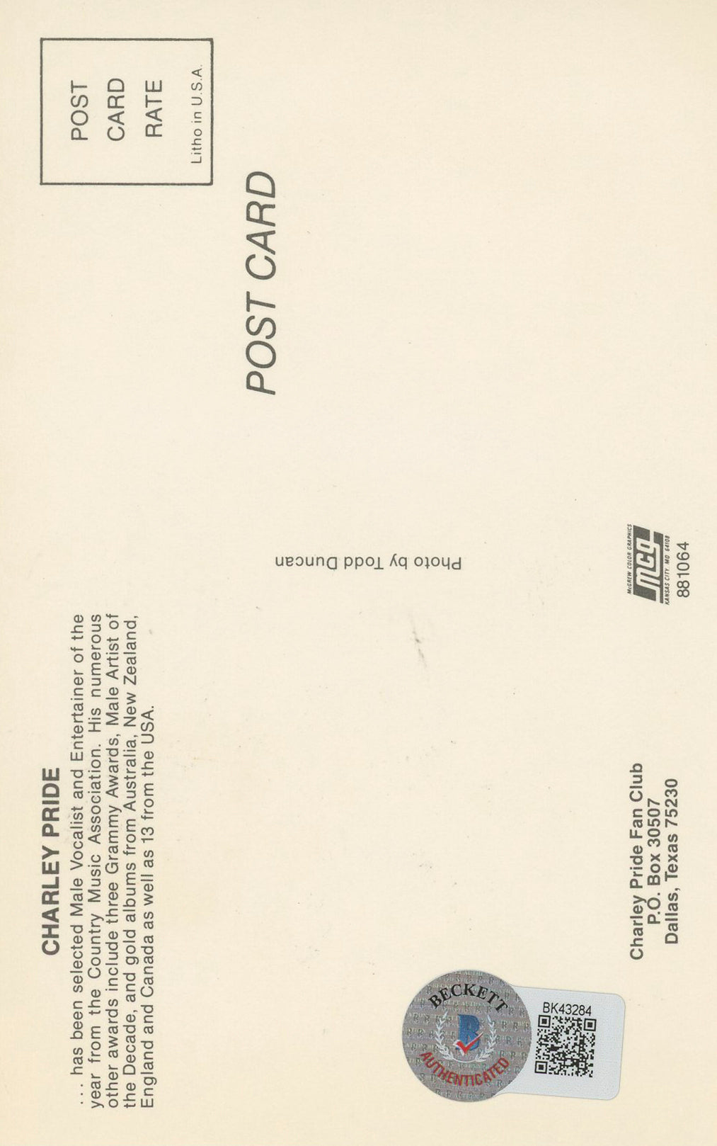 Charley Pride "To Don Thanks" Authentic Signed 3.5x5.5 Postcard BAS #BK43284 is backordered and will ship as soon as it is back in stock.