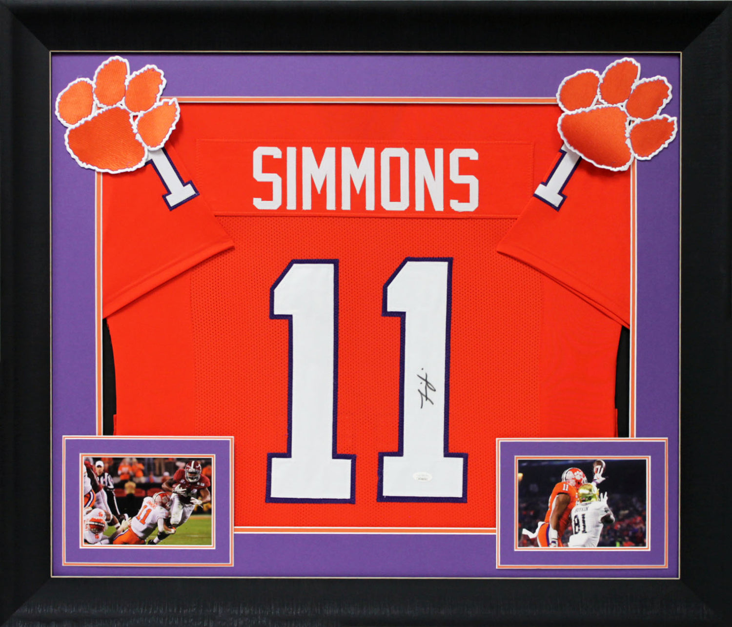 Own a piece of Clemson Tigers history with this Autographed Orange Pro Style Framed Jersey, personally signed by Isaiah Simmons. A standout linebacker and key player in Clemson's dominance, Simmons' signature makes this a must-have for fans and collectors alike. This framed jersey is 100% authentic, verified by the JSA Witnessed Protection Program, ensuring the autograph was directly observed by a JSA representative.