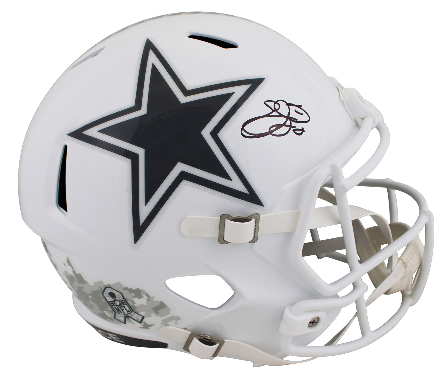 Own a piece of football history with this Autographed Alternate 2024 Salute to Service III Riddell Full-Size Speed Rep Helmet, personally signed by Emmitt Smith of the Dallas Cowboys. This exclusive collector’s item not only honors one of the greatest running backs in NFL history but also pays tribute to the league’s commitment to service with its striking design.