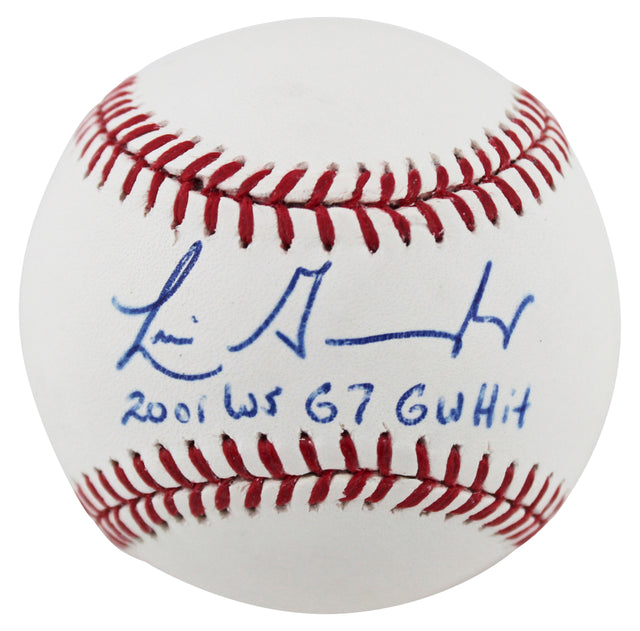 Own a piece of baseball history with this Luis Gonzalez Autographed OML Baseball, inscribed with "2001 WS G7 GW Hit"—a tribute to his iconic game-winning hit in Game 7 of the 2001 World Series. This collectible celebrates the Arizona Diamondbacks' unforgettable victory over the New York Yankees, securing their first-ever championship.
