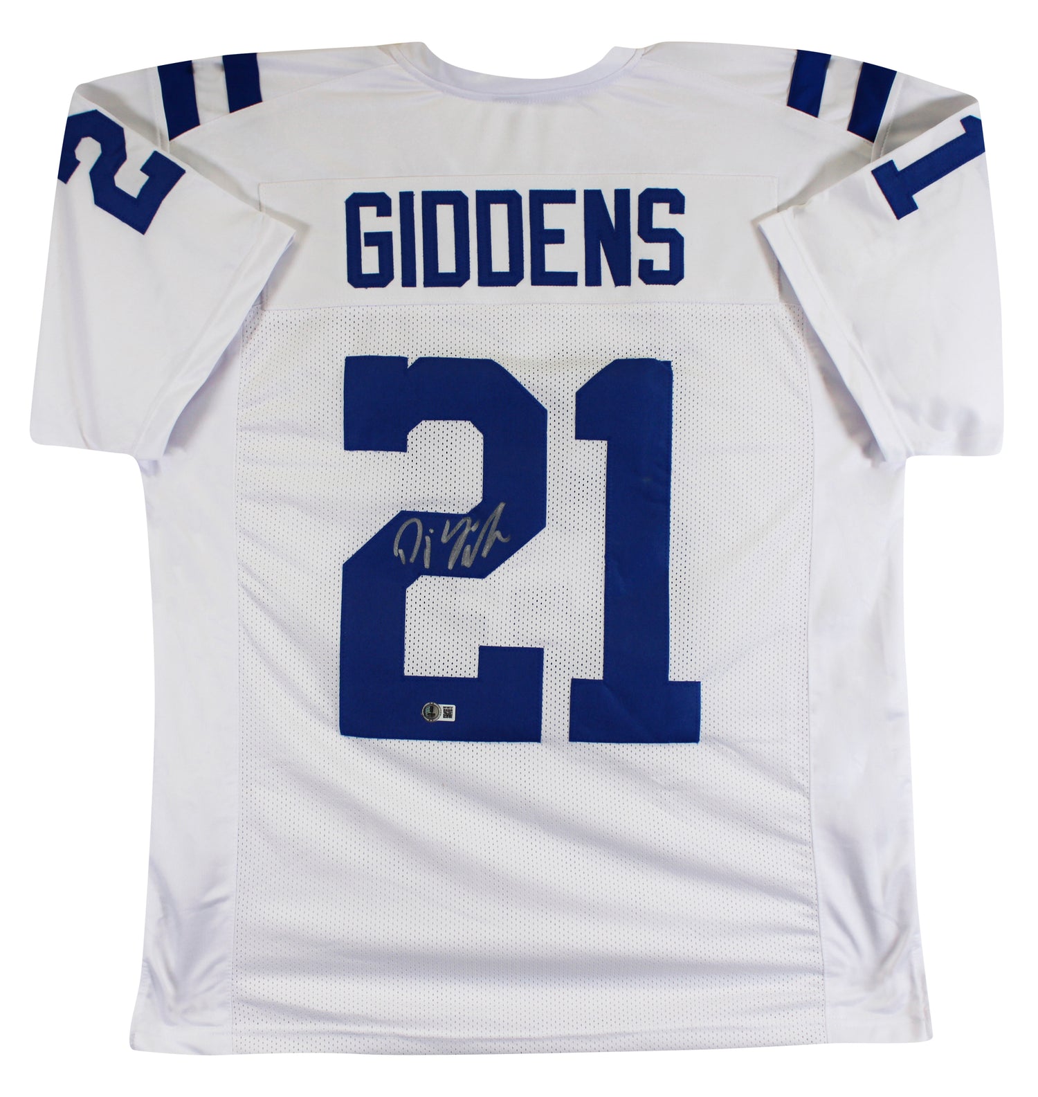 Add a standout piece to your sports memorabilia collection with this D.J. Giddens Autographed White Pro Style Jersey, signed by the rising star running back for the Indianapolis Colts. Known for his powerful runs and game-changing plays, D.J. Giddens is quickly becoming a fan favorite, making this signed jersey a must-have for Colts supporters and serious collectors. This jersey is authenticated by Beckett Authentication Services (BAS), one of the most trusted names in the industry, ensuring confidence in the item’s authenticity. It’s part of the BAS Witnessed Protection Program, meaning a Beckett representative was present during the signing—your guarantee of a genuine signature.