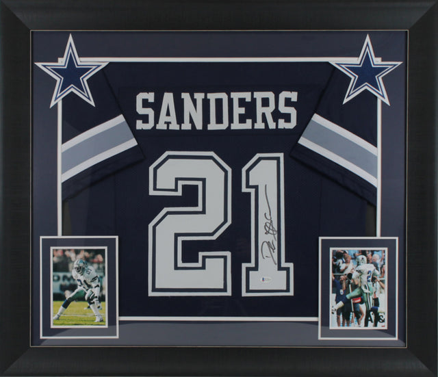 Own a piece of football history with this Autographed Navy Blue Pro Style Framed Jersey, personally signed by Deion Sanders of the Dallas Cowboys. A must-have for collectors and die-hard fans, this framed jersey is authenticated by Beckett Authentication Services (BAS), ensuring 100% authenticity.