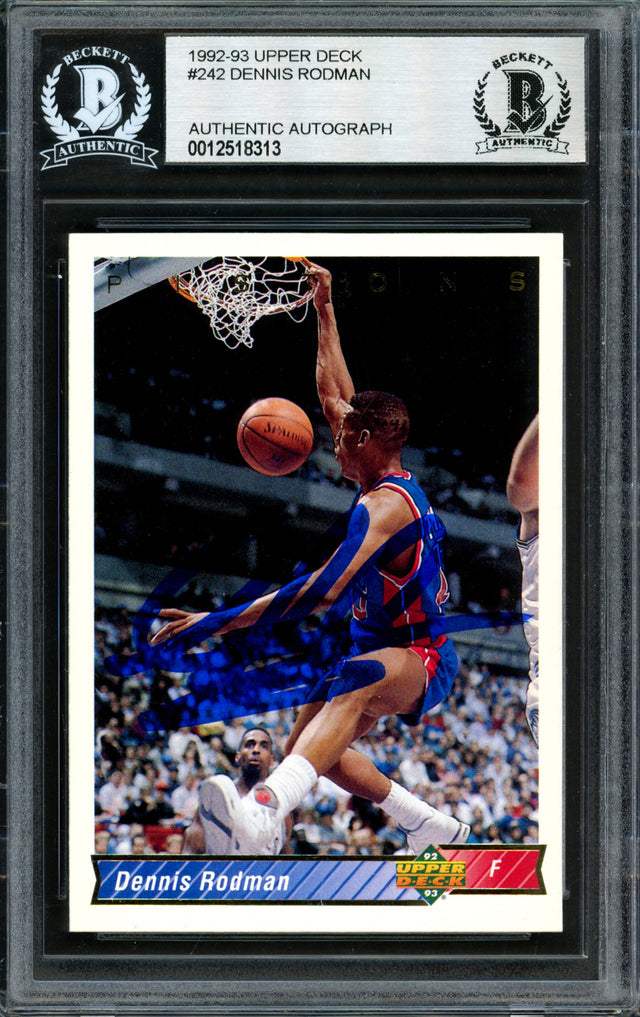Own a piece of basketball history with this 1992-93 Upper Deck Card #242, hand-signed by Dennis Rodman, one of the game's most legendary defenders and rebounders. This rare collectible has been professionally authenticated by Beckett Authentication Services (BAS) and comes securely encapsulated in their tamper-proof holder, ensuring its authenticity and long-term preservation.