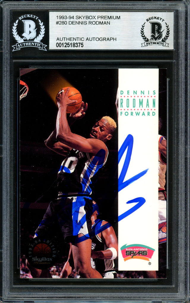 Own a piece of basketball history with this 1993-94 Skybox Dennis Rodman Card #280, hand-signed by the legendary defensive powerhouse himself. This rare collectible has been certified authentic by Beckett Authentication Services (BAS) and comes securely encapsulated in their tamper-proof holder, ensuring long-term preservation.