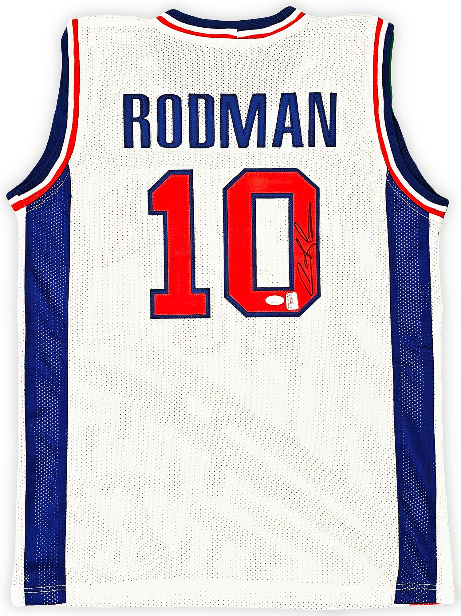 Own a piece of basketball history with this hand-signed Dennis Rodman White Jersey. A true collectible for fans of the legendary Chicago Bulls star, this custom jersey is crafted with high-quality sewn-in name and numbers for an authentic look and feel. Whether you're a dedicated memorabilia collector or a passionate basketball fan, this jersey is a must-have addition to your collection.