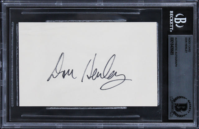 This rare and collectible Autographed 3x5 Index Card has been personally signed by legendary drummer and vocalist Don Henley of The Eagles, one of the most influential rock bands of the 1970s and beyond. Known for timeless hits like "Hotel California" and "Desperado," Don Henley is a Rock & Roll Hall of Famer whose legacy continues to resonate with music lovers and collectors alike. Authenticated by one of the most trusted names in memorabilia certification, this signed index card arrives slabbed and certified by Beckett Authentication Services, ensuring lifetime authenticity and value. Whether you're a lifelong Eagles fan, music historian, or pop culture collector, this piece is a must-have addition to your collection.
