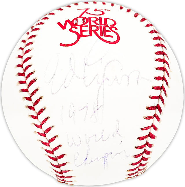 Own a piece of baseball history with this Official 1978 World Series Logo MLB Baseball, hand-signed by Ed Figueroa with the inscription "1978 World Champs." A key pitcher for the New York Yankees, Figueroa played a pivotal role in securing the team's back-to-back World Series titles in 1977 and 1978. This rare collectible is perfect for dedicated Yankees fans and memorabilia collectors alike.