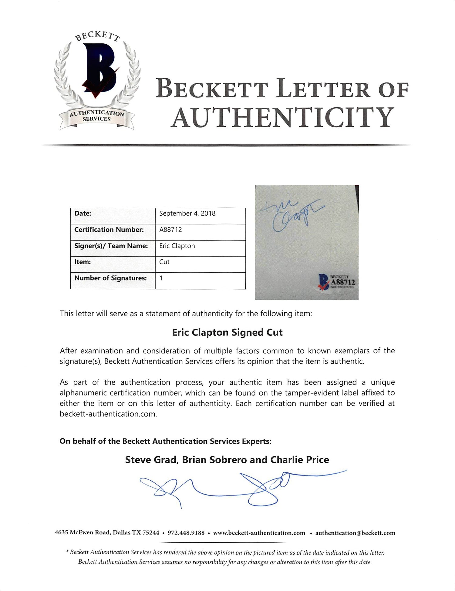 - Authenticity Guaranteed – Personally signed by Eric Clapton, this autograph comes with a Beckett Authentication Services (BAS) Certificate of Authenticity (COA) and hologram.