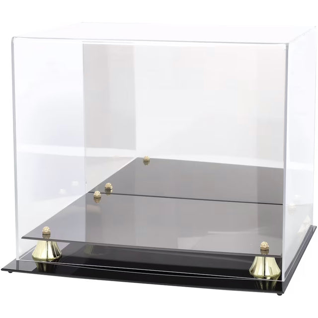 Showcase your prized collectible with the Golden Classic Full-Size Helmet Display Case, designed for both protection and presentation. This premium display case features a black acrylic base with gold risers and a mirrored back, creating a stunning backdrop for your helmet. Crafted from durable 1/8" thick acrylic, it includes a clear removable lid, ensuring easy access while keeping dust and damage at bay.