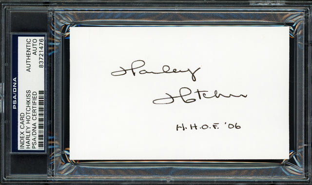 This 3x5 Index Card has been hand signed by Harley Hotchkiss, a legendary figure in the world of hockey and a key contributor to the growth of the sport in Canada. This rare collectible features the inscription "H.H.O.F. '06", marking Hotchkiss's induction into the Hockey Hall of Fame in 2006—a milestone that cements his legacy as one of the sport's most influential builders. Authenticated by PSA/DNA and sealed within their tamper-proof holder, this piece offers lasting protection and verified authenticity for discerning collectors. Whether you're a passionate fan of the NHL or a memorabilia enthusiast seeking to preserve hockey history, this signed index card is a meaningful and valuable addition to any collection.