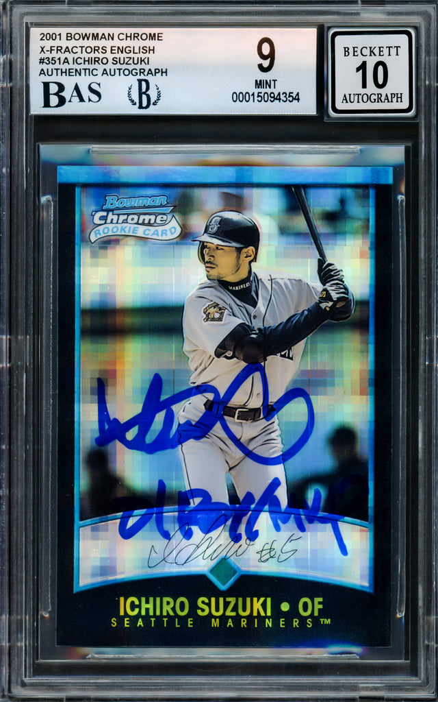 Ichiro Suzuki Autographed 2001 Bowman Chrome X-Fractor English Rookie Card #351A Seattle Mariners BGS 9 Auto Grade Gem Mint 10 "01 ROY/MVP" Beckett BAS #15094354