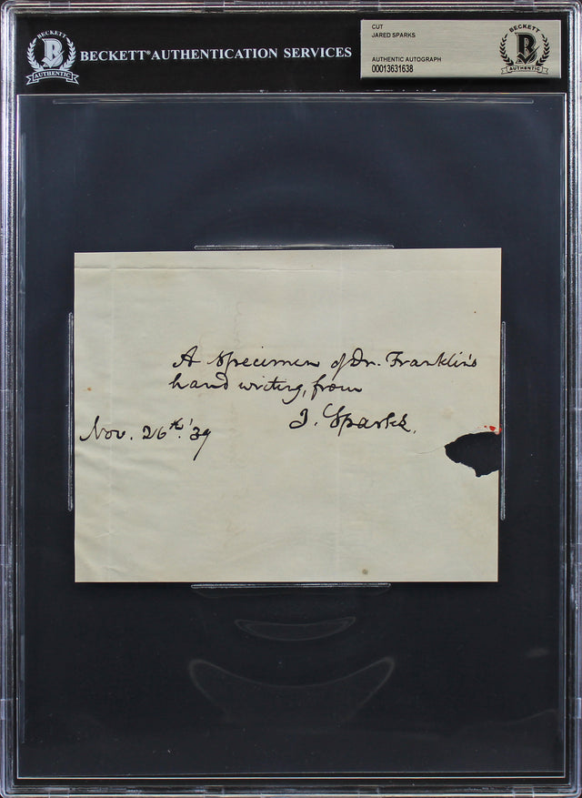 This Autographed Dated November 23, 1839, 5x6.25 Cut Signature features the personal signature of Jared Sparks, along with the inscription: *"A specimen of Dr. Franklin's handwriting, from, Nov. 26th, 39 (1839)."* This unique historical artifact is directly related to a collector's request for Benjamin Franklin's handwriting, making it an extraordinary piece for passionate collectors and history enthusiasts.