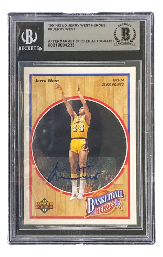 Celebrate basketball history with this Jerry West signed 1991-92 Upper Deck Jerry West Heroes #6 trading card—a must-have for true NBA collectors and fans of "Mr. Clutch." Hand-signed by the legendary Jerry West, this iconic card honors his storied career and lasting legacy in the sport. Authenticated and slabbed by Beckett, this collectible guarantees both authenticity and long-term preservation. Whether you're a lifelong Los Angeles Lakers fan or passionate about collecting NBA greats, this card is a standout addition to any collection. Known as the model for the NBA logo, Jerry West's impact on the game remains unmatched.
