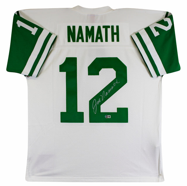Own a legendary piece of football history with this Joe Namath Autographed White Mitchell & Ness Jersey, a must-have for diehard New York Jets fans and serious memorabilia collectors. Personally signed by Hall of Fame quarterback Joe Namath during a private signing, this jersey celebrates a player who not only defined an era but delivered one of the most iconic Super Bowl moments of all time—his famous guarantee and victory in Super Bowl III. Namath's impact on both the NFL and American pop culture makes this signed jersey a centerpiece item for any sports collection.
