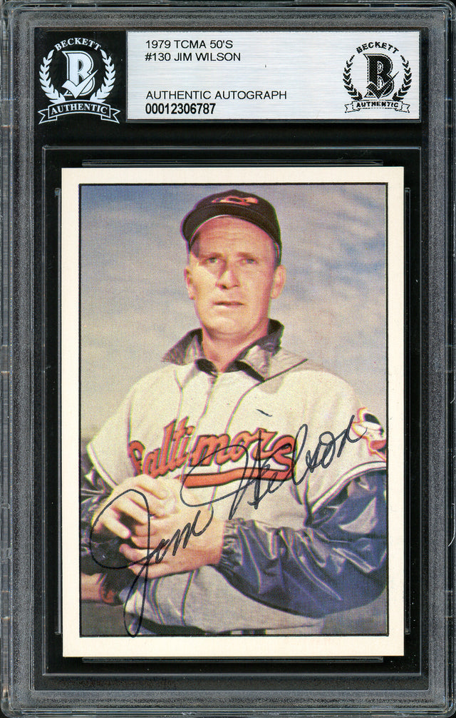 This 1979 TCMA Card #130 has been hand-signed by Jim Wilson, making it a valuable addition to any baseball memorabilia collection. Encapsulated and certified authentic by Beckett Authentication Services (BAS), this rare collectible is protected in a tamper-proof holder for long-term preservation.
