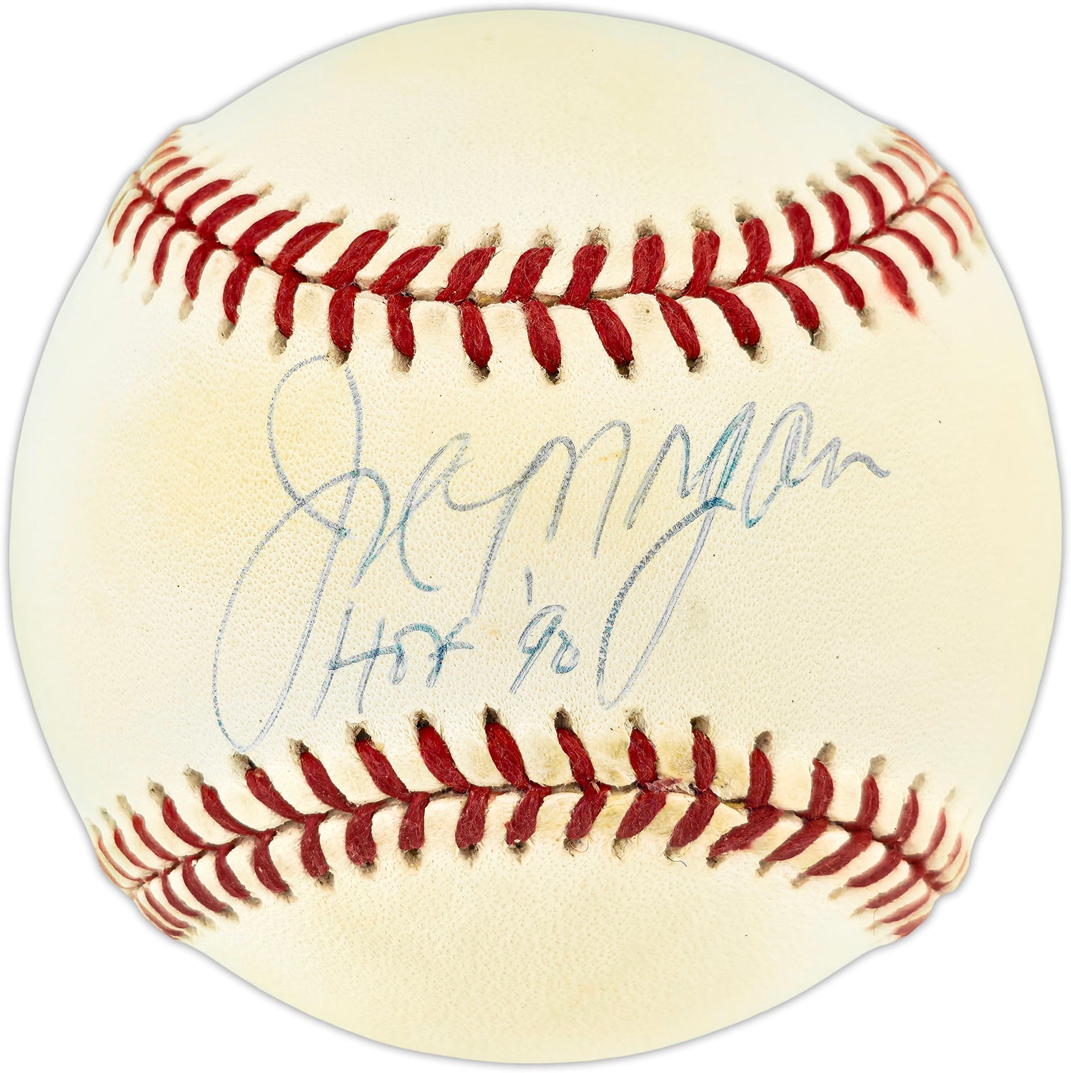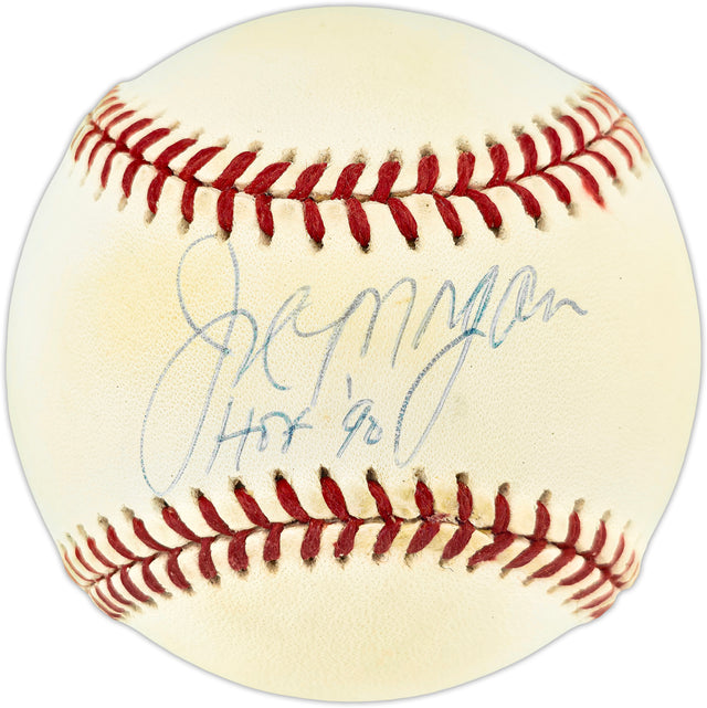 This is an exceptional collectible for die-hard baseball fans and memorabilia collectors—a Joe Morgan autographed Official National League Baseball, complete with the "HOF 90" inscription to commemorate his 1990 induction into the National Baseball Hall of Fame. A standout piece honoring a legendary second baseman, this ball captures a moment of baseball history, celebrating Joe Morgan’s remarkable career—most notably with the Cincinnati Reds during their iconic Big Red Machine era of the 1970s. While the ball shows some toning, it adds authentic vintage charm and character to this item, making it an even more compelling addition to any collection.