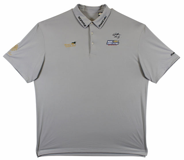 Own a true piece of golf history with this Match Worn Grey Mark Christopher Wentz Financial SQAIRZ Mobix Labs Trump Golf Polo Shirt, personally signed by legendary golfer John Daly. This exclusive item was match-worn by Daly himself and comes directly from his personal collection, making it a must-have for serious collectors and golf enthusiasts.