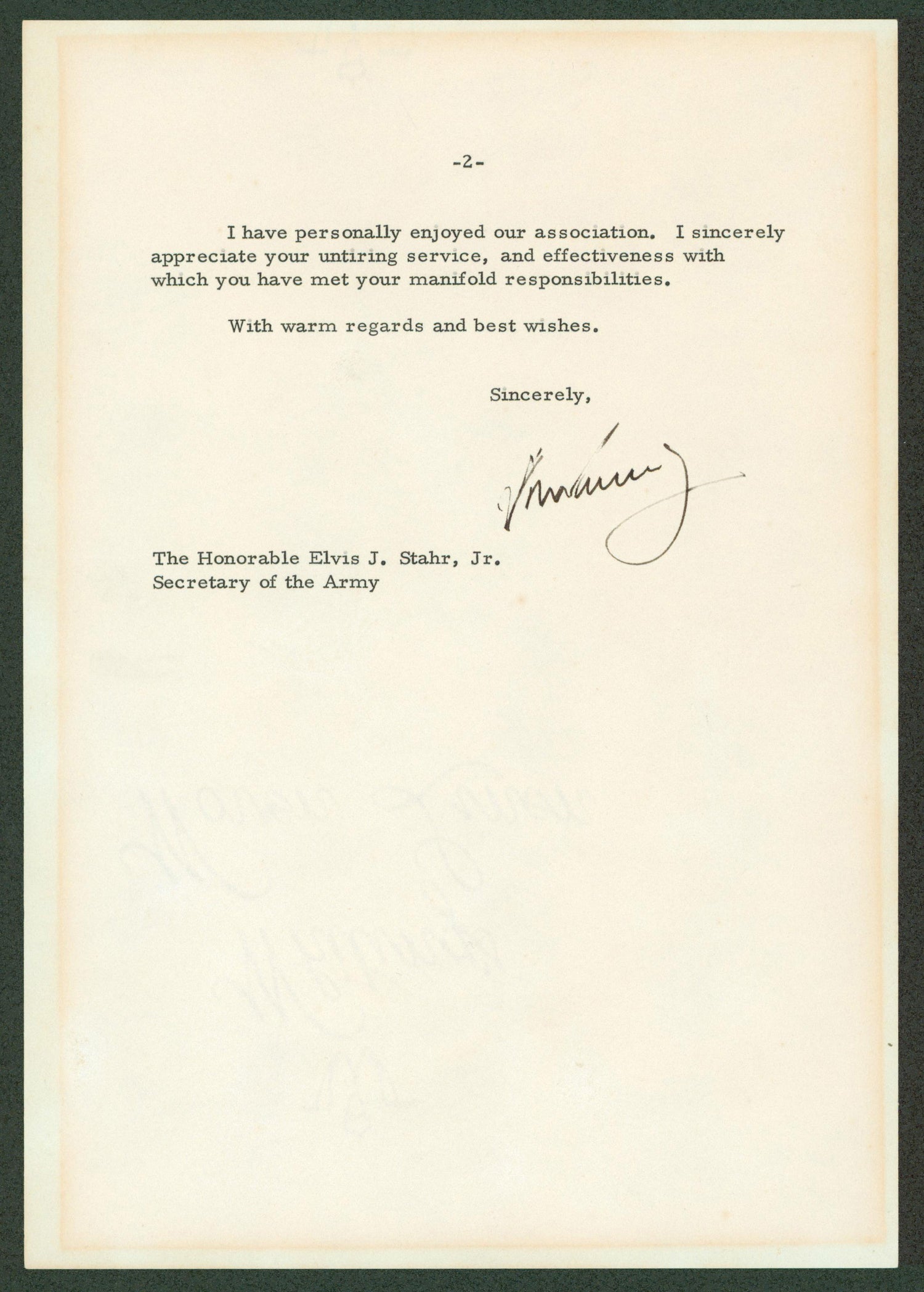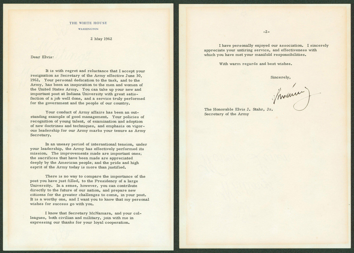 Own a piece of American history with this John F. Kennedy Autographed Letter dated May 2, 1962, on official White House letterhead. This extraordinary 7x10.25” two-page letter features Kennedy's personal reflections on the resignation of Secretary of the Army Elvis Jacob Stahr Jr., who played a critical role during key moments such as the Berlin Crisis and the Bay of Pigs invasion.