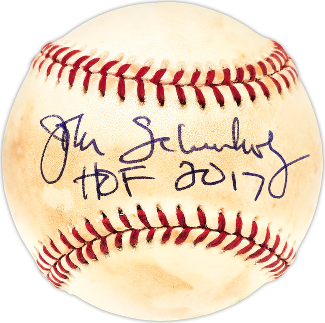 This Official 1995 World Series Logo MLB Baseball has been hand-signed by Hall of Fame executive John Schuerholz and inscribed with "HOF 2017," commemorating his induction into the Baseball Hall of Fame. A key figure in shaping championship-winning teams, Schuerholz played a pivotal role in the success of the Atlanta Braves during the 1990s, making this a prized collectible for baseball enthusiasts.
