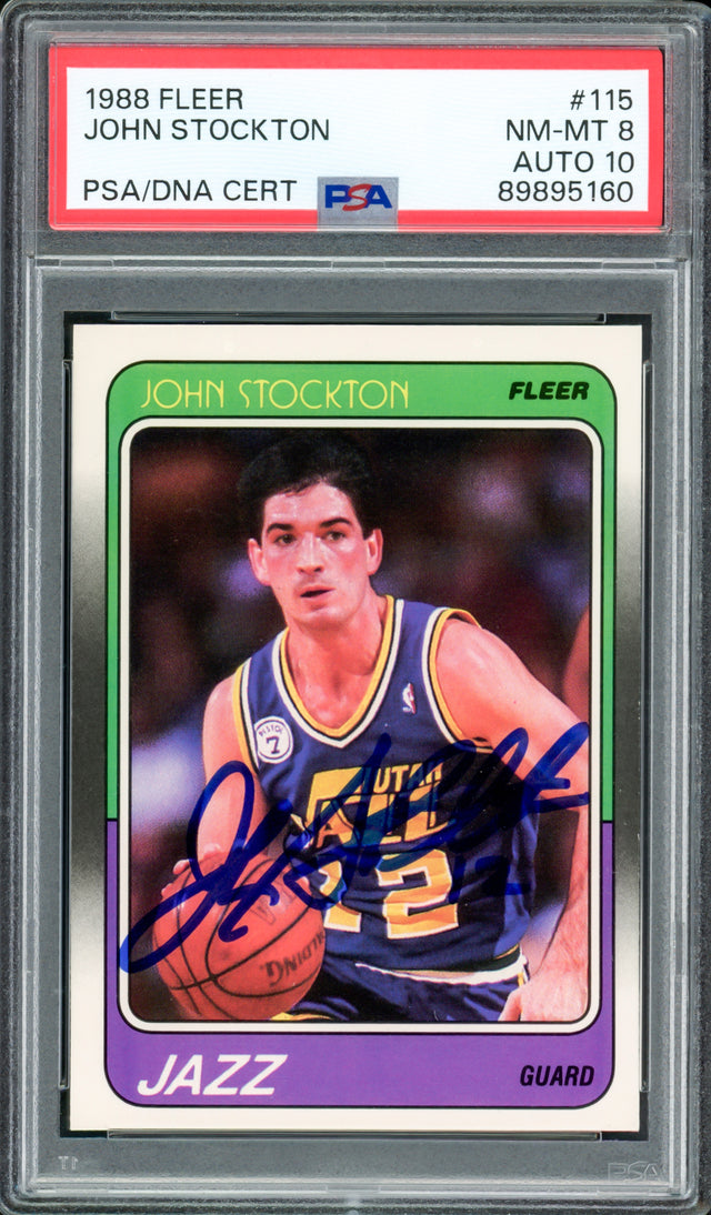 John Stockton Autographed 1988 Fleer Rookie Card #115 Utah Jazz PSA 8 Auto Grade Gem Mint 10 PSA/DNA #89895160