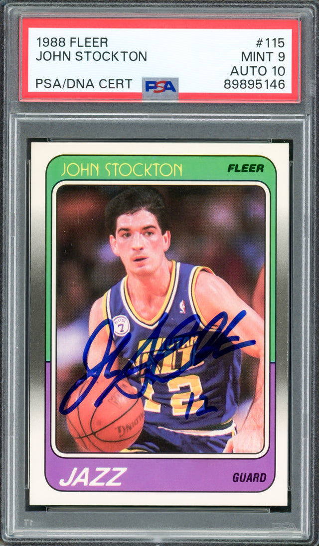 John Stockton Autographed 1988 Fleer Rookie Card #115 Utah Jazz PSA 9 Auto Grade Gem Mint 10 PSA/DNA #89895146
