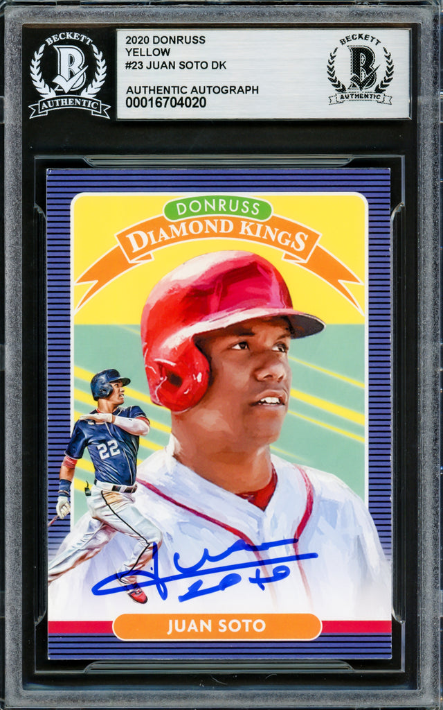 Own a piece of baseball history with this 2020 Donruss Diamond Kings Yellow Card #23, hand-signed by superstar Juan Soto. This rare collectible has been authenticated by Beckett Authentication Services (BAS) and comes securely encapsulated in their tamper-proof holder, ensuring its long-term preservation.